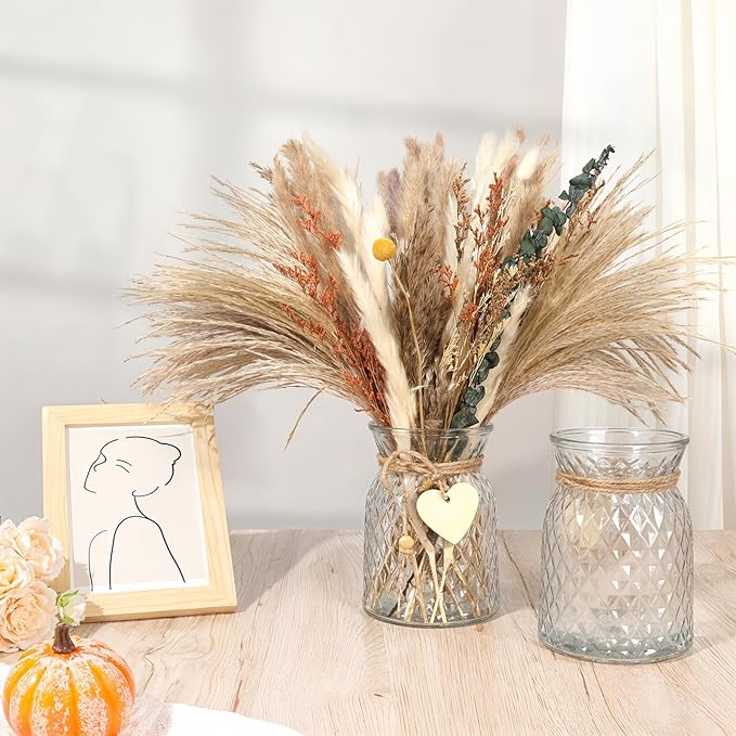 - ARTIFICIAL FLOWERS IN VASE FOR CENTER TABLE DECORATIONS:Create a bohemian feel for your desired setting with our natural dried pampas grass decorations! It comes with 2 glass vases, eliminating the need for you to prepare separate vases, and is perfect for creating a focal point on your dining table. The timeless and classic look of pampas grass will never go out of style, and there are so many ways to get creative with it, from wall hangings to table centerpieces to wedding decorations