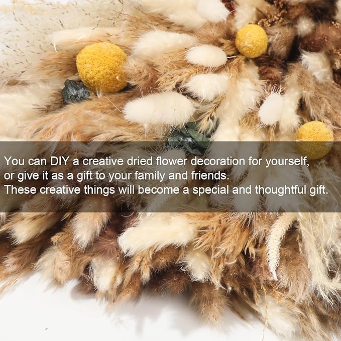 - ELEGANT DESKTOP CENTERPIECE:Our dried pampas grass bouquet has a total of 133pcs, including primary color small reed,white small reed,everlasting eucalyptus leaves,primary color golden balls,small whisks,everlasting lover grass,primary lover grass,white rabbit tail grass,silver grass,white lover grass,white unicorn grass.Pampas grass can be easily mixed and matched with other decorative elements.Use your creativity and aesthetics to DIY your own unique dried pampas grass bouquet decoration