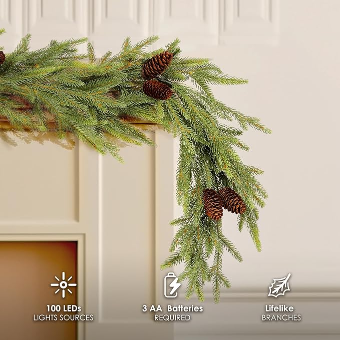 - Lifelike look: 6FT Realistic high quality Christmas garland that resembles natural greenery. Scattered with real pine cones, our pre-lit faux wreath recreates the dark green foliage—stiff leaves that only resemble pine needles—of the Norwegian botanical, with bendable branchlets that can be adjusted for the most lifelike look.