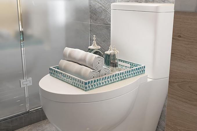 - [BEAUTY & FUNCTION] The special mother of pearls coating textures and colors adds oriental character and a luxury touch to many styles of decor. It will be much more beautiful under lights as nacre reflects lights into different colors, making this decorative wooden ottoman serving tray a perfect decorative tray for coffee table, and unique serveware centerpiece for the dining table, dining table, bathroom, living room and your home or events. PEMAR rectangular coffee trays with handles are great boho farmhouse rustic decorative trays available.