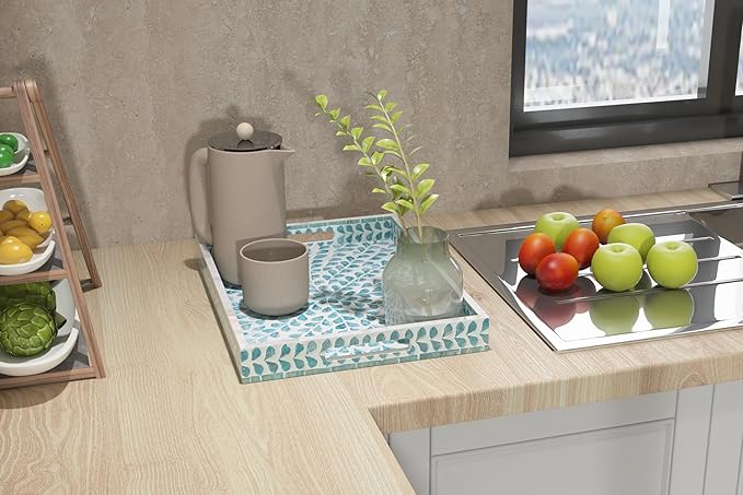 - [PREMIUM QUALITY] Our mother of pearl inlay serving, and coffee trays are handcrafted by Vietnamese artisans. It is light, made of wood and handmade to last a long time. The tray is designed with an inserted handle so it's easy to carry around. The bottom is covered with a soft, thick layer of paint so the tray leaves no scratches on the table surface during usage. Mother of pearls has long been the favorite luxury decorative material in Asia for centuries.