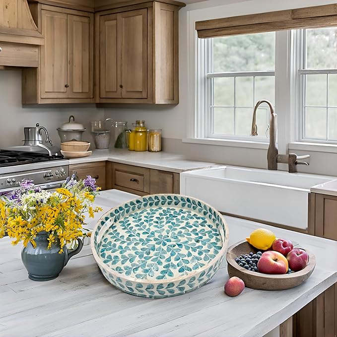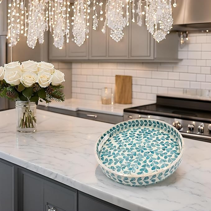 - [STYLISH MOSAIC TRAYS] with the great workmanship by Vietnamese artisans at PEMAR, flawlessly finished with strong wood core and blue mosaic pattern well-sorted mother of pearls / capiz shells lacquered on the surfaced. Our round lacquer tray creates an elegant handmade decorative centerpiece to your dining table, coffee table or any room, best matches any beach, coastal, nautical, mosaic decor