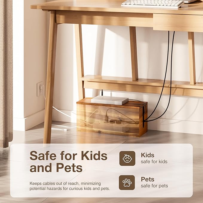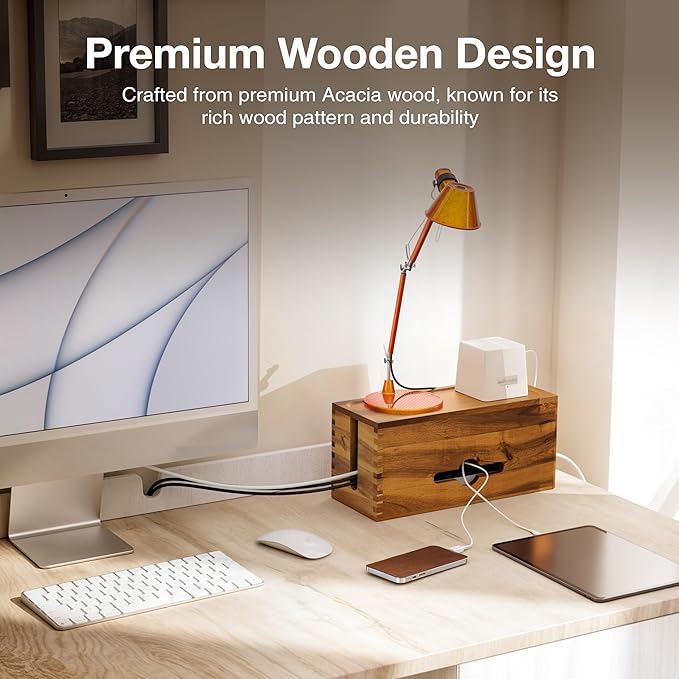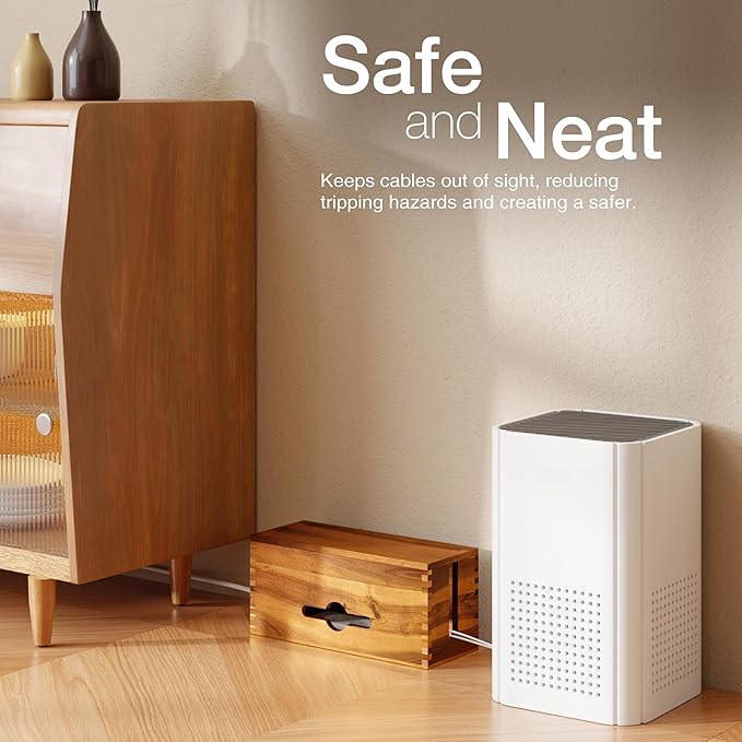 - High-Quality Acacia Wood: Crafted from durable acacia wood with a smooth natural finish, this cable management box is built to withstand daily use while adding understated sophistication to any space. Its generous 15"L x 6"W x 6.9"H size accommodates most power strips, surge protectors, and excess cables—keeping your setup tidy without taking up unnecessary room.