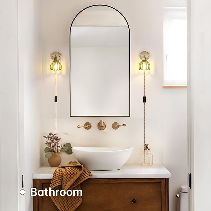 Plug in Wall Sconce, Green Tulip Glass Lampshade Wall Light Plugin Corded for Bedside Bedroom Doorway