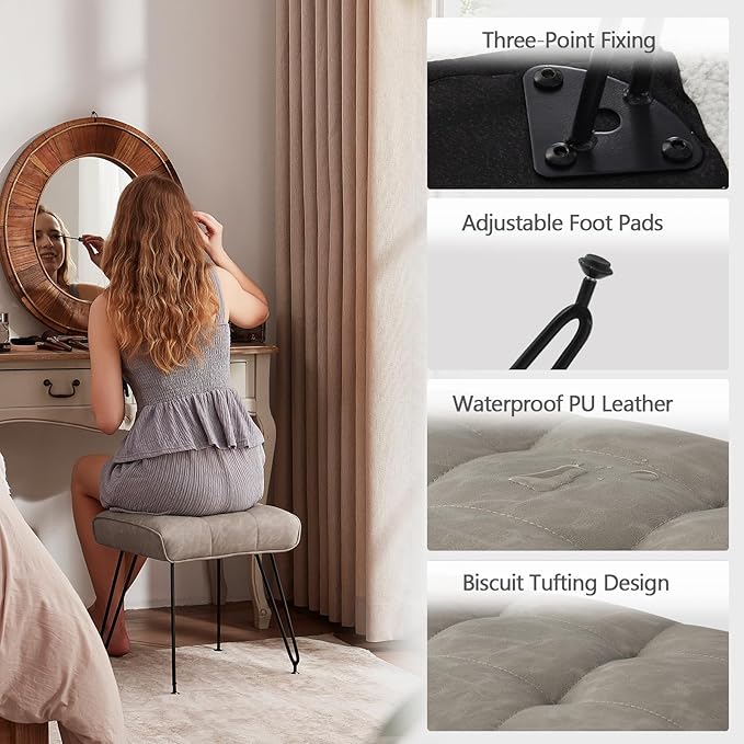PU Leather Vanity Stools, Vanity Stool Chairs for Makeup Faux Leather Foot Stools Ottoman with Metal Leg Make up Chairs for Vanity Small Bench Seat for Living Room Bedroom (Gray)