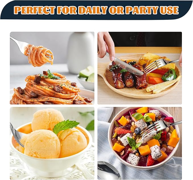 - ERGONOMIC HANDLES DESIGN: The silverware set for 12 adopts mirror design, highlighting the modern fashion sense, adding more flavor to your table setting. The highly mirror-polished smooth edges of the cutlery with no rough spots or sharp edges don't cause any discomfort to your mouth. Meanwhile, the flatware set for 12 has an ergonomically designed grip that conforms to the curve of the human hand, making it more comfortable for you to hold and enjoy your mealtime with ease.