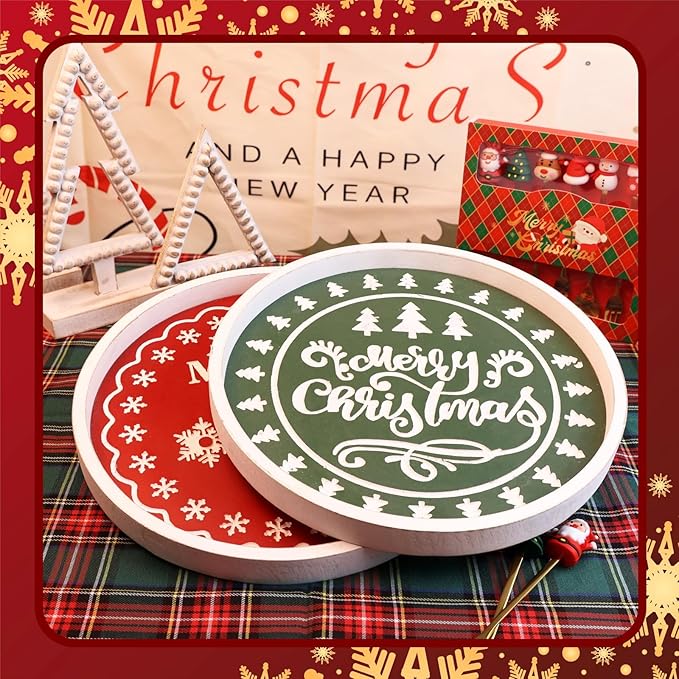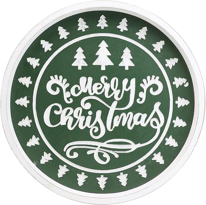 Christmas Wood Decorative Ottoman Tray for Coffee Table Kitchen Counter, Living Room, Round Handcrafted Green Wooden Serving Tray for Table Centerpiece
