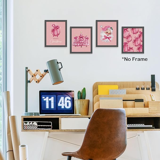 TLESKE Pink Winter Merry Christmas Coquette Bow Posters Prints Unframed Set of 4 for Teen Girls Dorm Bedroom Living Room, Santa Claus Christmas Ball Pine Trees Wall Art Prints Pictures Decor, 8x10