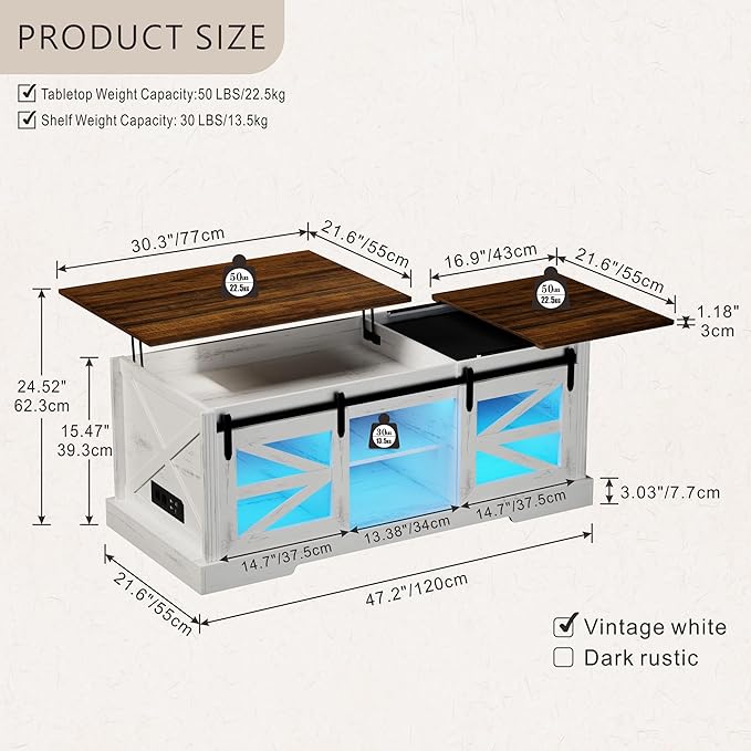 - [Large storage space]: 21.7D*47.3W*19.7H inches, this farmhouse coffee table has two cabinets and a central open storage compartment, and is equipped with sliding barn doors. The layers of storage compartments on both sides can be detachable to place items of different heights, effectively storing and enhancing the beauty of the space