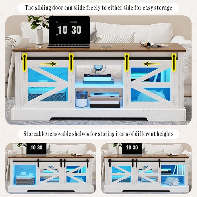 Farmhouse Coffee Table, Lift Top Coffee Table with Gun Cabinet, 2 Sliding Barn Doors-Large Storage and 3 Color LED Lights fit Modern Rectangular Rustic Living Room Center Table,White