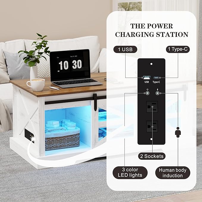 - [Convenient multi-functional coffee table]:A powerful charging station, 1 USB and 1 Type-C, 2 sockets, also equipped with blue, yellow, white 3 colors LED light and human sensor. Open the light switch, continue to click the button to switch different lights, long press to adjust the brightness of the lamp; Human sensor light: open the light switch, and then light the human sensor button, when the person is near, the light will automatically light up, when the person leaves, the light will automatically go out. Do not want to use the human body sensor light, you can click the button to turn off