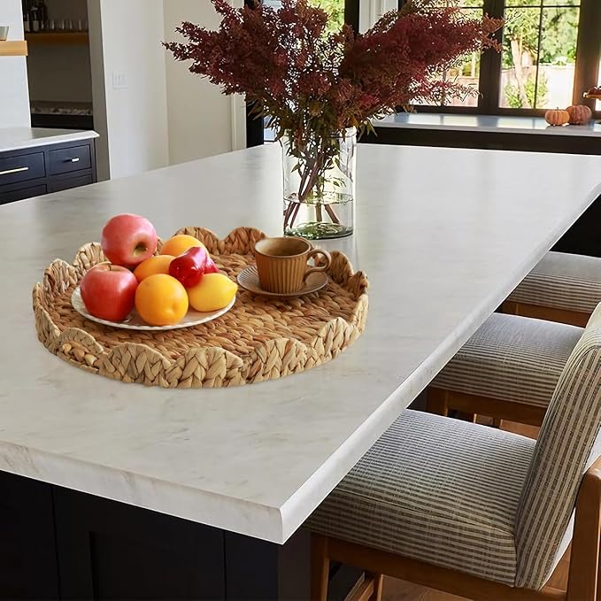 Extra Large Round Ottoman Table Tray 19.7" with Handles - Water Hyacinth Wicker Serving Tray for Farmhouse Decorative Oversized Coffee Table Trays Living Room Kitchen Counter Breakfast Scalloped