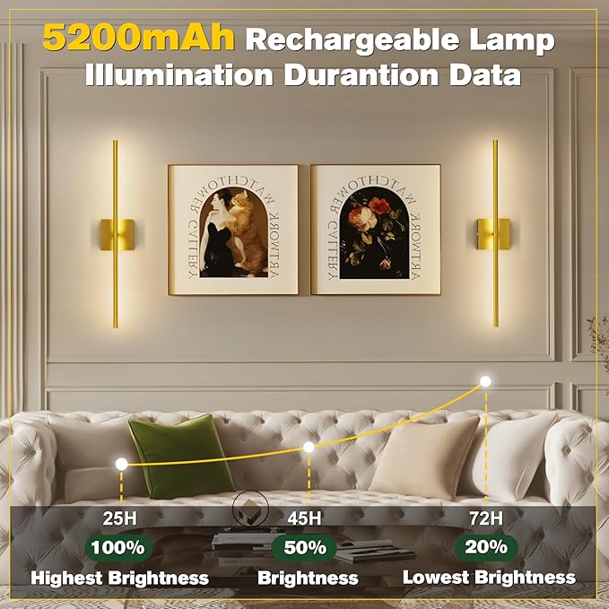 - 5200mAh Battery with Long Battery Life:The battery operated sconces set of two has a built-in 5200mAh battery,and the charge takes less than 5h. Rechargeable sconces can work continuously for more than 30h at the highest brightness