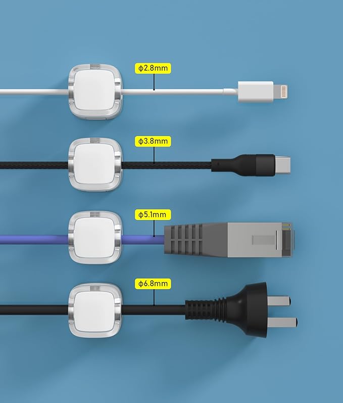 - Hold Most Cords: Diameter of about 0.3 inch (7.5mm) allows to hold most cords, such as Type-C charger cords, lightning cords, HDMI cords, USB cables, PC Notebook power wires, network wires, mouse cords, keyboard cables, headphone cords