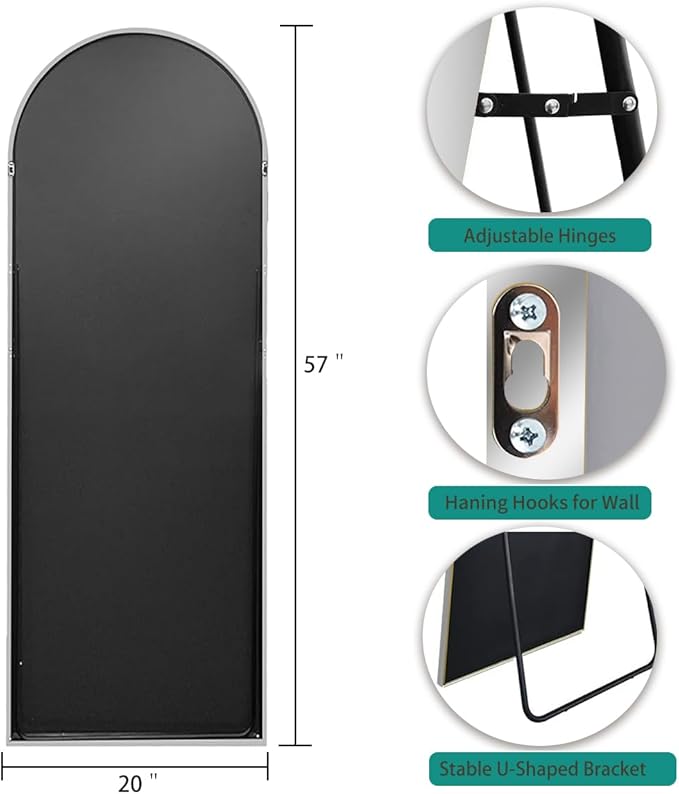 - 【Arched-Top Design】Arched floor mirror is designed with an arched top frame. The mirror is surrounded by an aluminum alloy frame.The frame is very thin,brushed, and more textured. It is very conspicuous in any space and makes your room look tasteful
