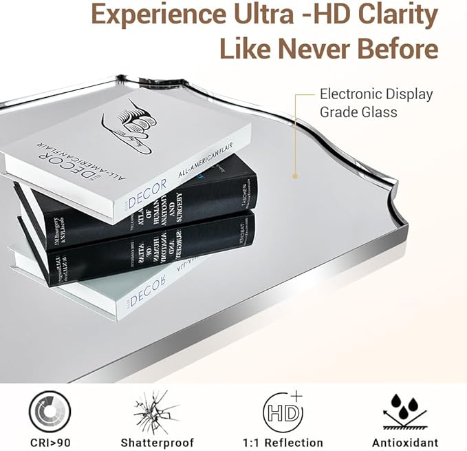 - 【Rust-Proof Stainless Steel Frame】: (N.W:21.8LBS). Crafted from stainless steel with oxidation-resistant properties, this chrome mirror for bathroom offers enhanced stability and a longer lifespan. Shatterproof 4mm HD glass is supported by a 9mm MDF backboard (most others just 3mm ), surrounded by a 1/17" gap with unique curved corner design to give a seamless finish