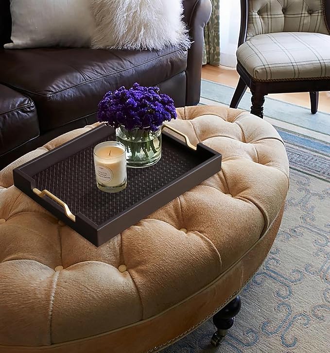 - Sturdy Construction: Crafted from durable materials, the tray features a smooth black finish and convenient handles. Made of beautiful faux leather, mdf, velvet, ottoman tray dimension: 16.2 x 12.2 x 2 inches.
