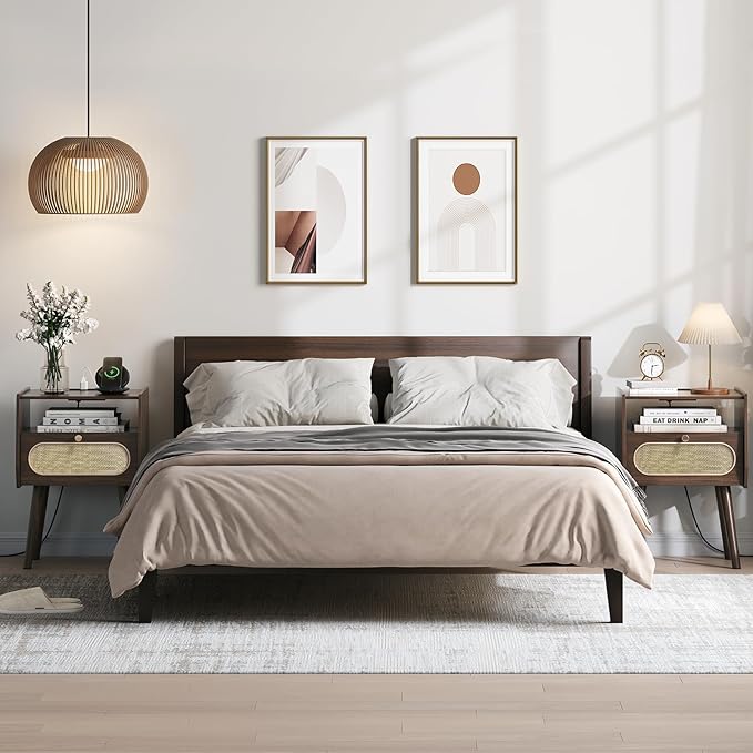 - Spacious Storage with Drawer & Open Shelf: The walnut nightstand set of 2 designed with functionality in mind, each wood nightstand features a smooth-gliding drawer with woven rattan front and an open storage shelf for books, remotes, or décor. Keep your essentials organized and within easy reach, whether as a bedside table or end table in your living room furniture setup