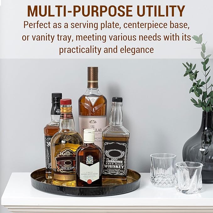 - 12-inch-round deluxe gold-toned hammered aluminum decorative tray with contrasting black accents for a modern art deco aesthetic **Proudly Handcrafted in India**
