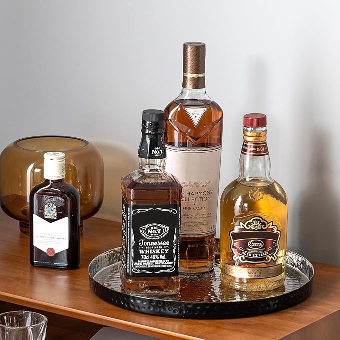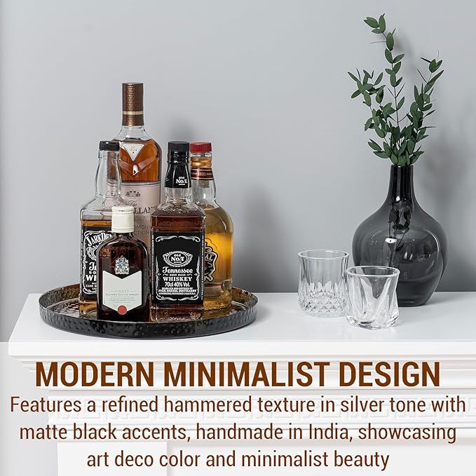 - 12-inch-round deluxe silver-toned hammered aluminum decorative tray with contrasting black accents for a modern art deco aesthetic **Proudly Handcrafted in India**