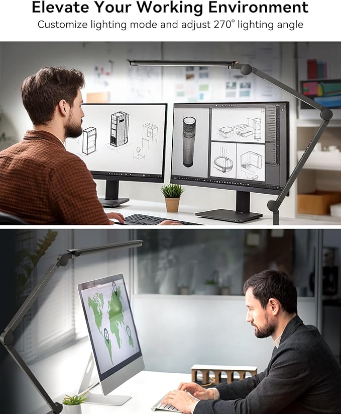 - [Multiple Lighting Effect]: Swing arms led desk light features stepless dimming function which allows you to freely adjust different brightness from 10% to 100% and color temperature range from 3000K to 5700K, switching the lighting color from warm white, nature white to cool white to meet your lighting needs, ideal for providing clear and comfortable illumination to study room, living room, bedroom, office, workshop, repair shop and more