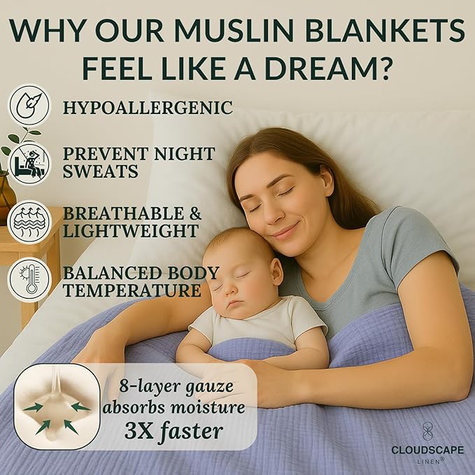 - CLOUD-LIKE SOFTNESS & BREATHABILITY – Experience a new level of comfort with our Extra Large 8-Layer Muslin Throw Blanket. Crafted from 100% pure cotton gauze, this blanket feels luxuriously soft and is perfectly sized at 50" x 70" for cozying up.