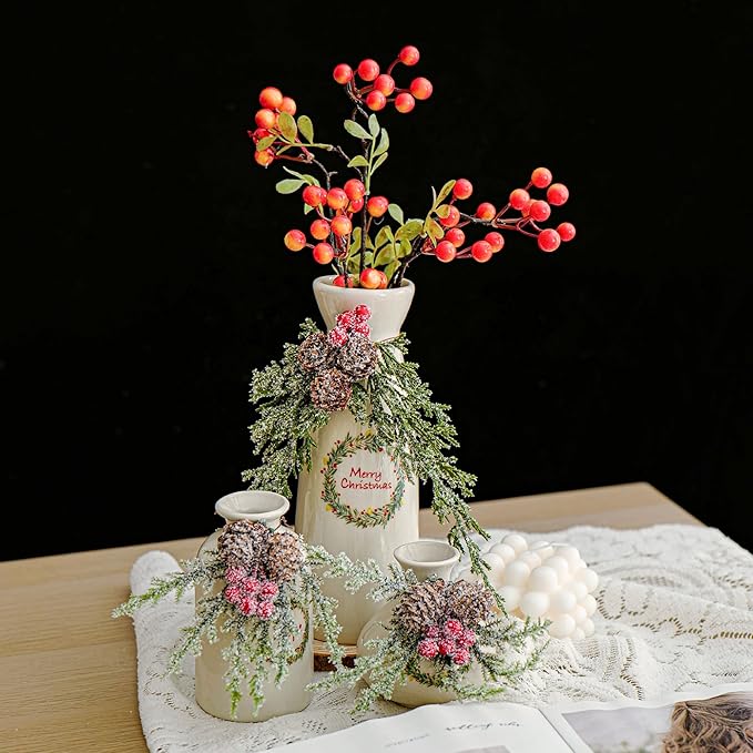 - Festive Decor Vase : This set of 3 vases features a white ceramic finish adorned with pinecones, berries, and evergreen accents for a cozy holiday look.
