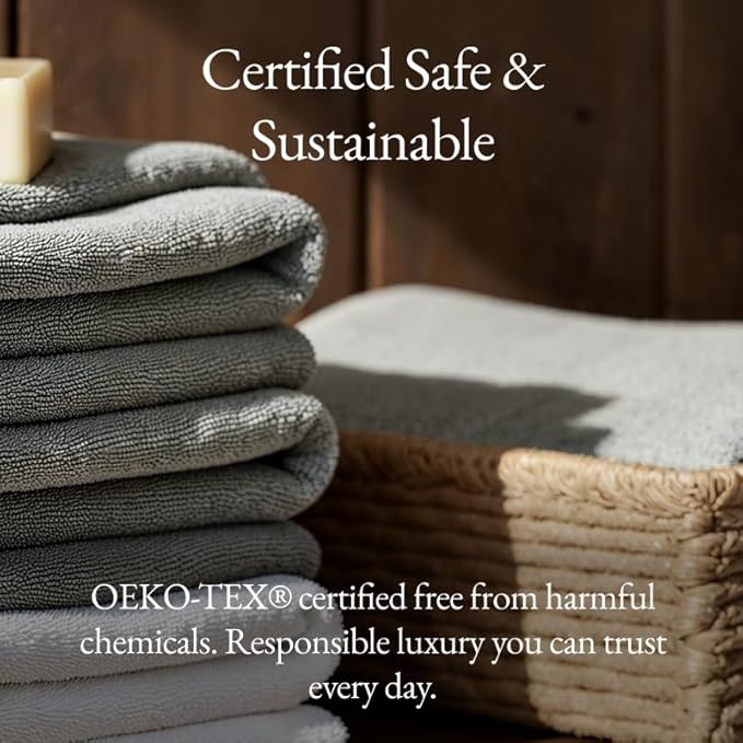- Oeko-Tex Certified for Eco-Friendly Comfort – Certified by the Oeko-Tex Standard 100, these towels are guaranteed free of harmful chemicals, ensuring safety for you and your family. The towels are made from sustainably sourced Australian cotton, known for its high quality and water-efficient cultivation, so you can indulge guilt-free in everyday luxury