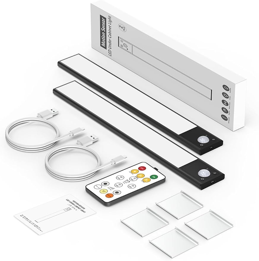 12" Ultra-Thin Under Cabinet Lighting Wireless, Aluminum Alloy Under Counter Lights for Kitchen, 3-Color-Temps Magnetic Closet Lights, Rechargeable Motion Sensor Light Indoor (2 Pack, Black)