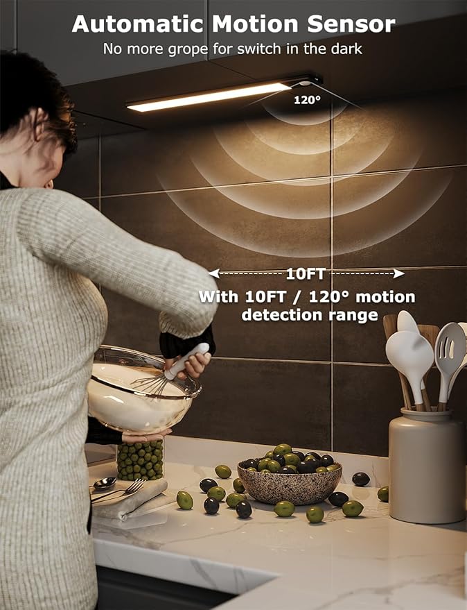 - 【3 Modes, Daylight & Motion Sensor Indoor Lights 】— 1. In motion mode, the closet lights motion sensored will turn on when movement detected within a 10ft range. — 2. In night mode, it will auto-turn on when detects movement in low-light or dark environments. — 3. Meanwhile, it can also be set to always-on mode when needed. They are ideal for closet lighting, under-counter light fixtures, wireless display lighting, etc.