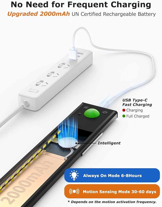 - 【USB-C Rechargeable Under Cabinet Lighting】— These closet lights battery operated have a built-in 2000mAh upgrade high-capacity USB-C rechargeable battery. A full charge lasts 30-60 days in sensor mode (depending on how often you use it) or 6-8 hours in always-on mode (100% brightness). They are lights for closet with no electricity, closet light no wiring.