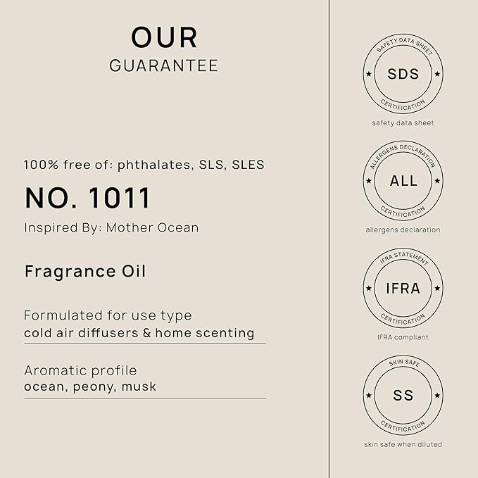 - Luxury hotel aroma oil diffuser. The scent No.1011 inspired by Mother Ocean would capture the essence of a carefree, beachside escape where the vast, calming ocean meets the laid-back, tropical vibes of paradise. This fragrance would blend refreshing marine notes with bright, fruity accents and a hint of sun-kissed warmth.