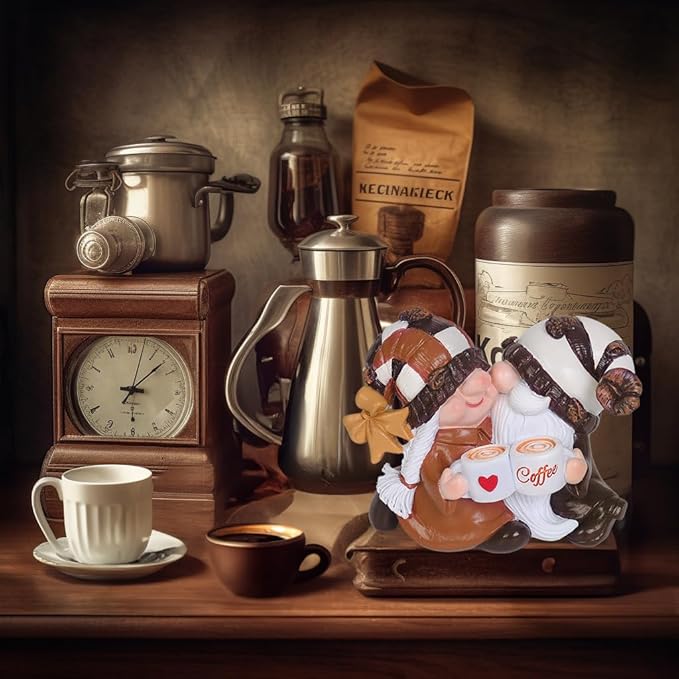 - 【Unique Gnomes Design】cute gnomes,Fine carvings and romantic coffee-themed accessories, these gnomes are sure to capture your heart. They feature a unique design with coffee cups in hand and striped plaid hats topped with , The lovely cheers sign and mutual dependence in the gnome's arms making, them a delightful and eye-catching accent to any table or mantelpiece display.gnomes are an outstanding accent to any coffee bar, kitchen or living space and are sure to impress your guests.