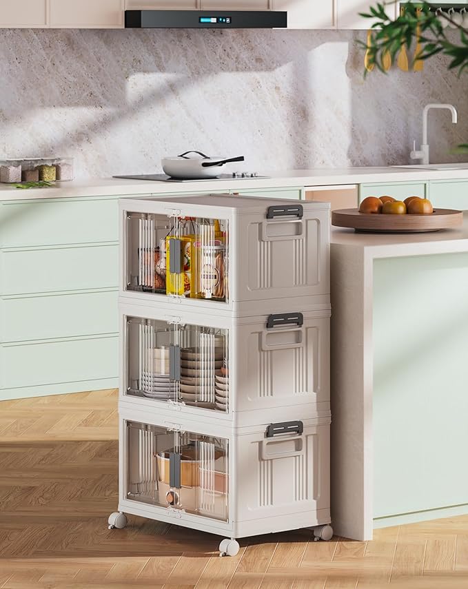 OlarHike 48QT Stackable Storage Bins with Lids - Folding Storage Box with Doors and Wheels, Collapsible Plastic Storage Bins for Closets, Home Organization, 3 Pack Cubes (Warm Gray)