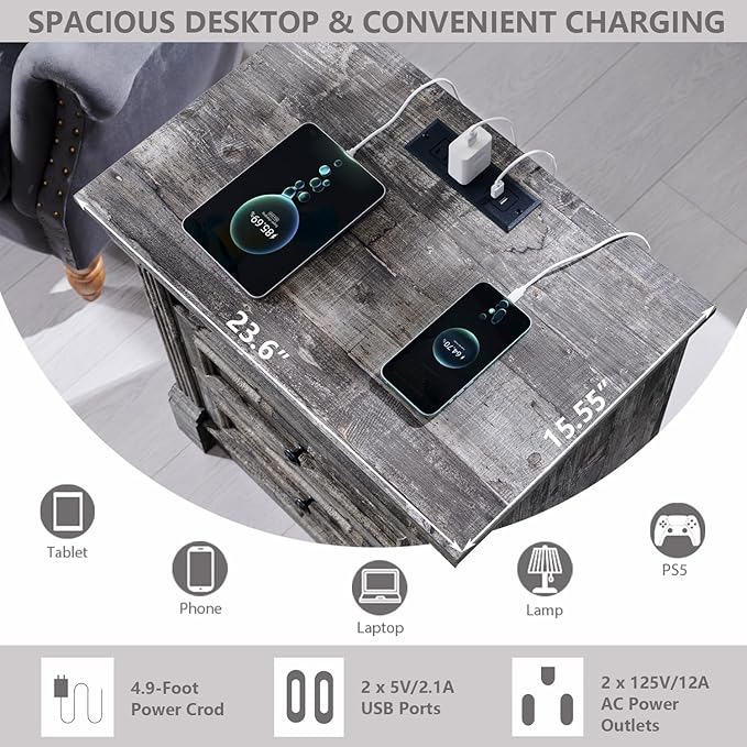 - CONVENIENT CHARGING STATION: Farmhouse nightstand featuring a built-in charging station. Equipped with 2 USB ports and 2 AC power outlets, it ensures your devices are always charged and ready to go. The back panel includes a 2.3-inch diameter cable management hole, keeping your space neat and organized. With a spacious tabletop, you have plenty of room for your essentials and favorite decor