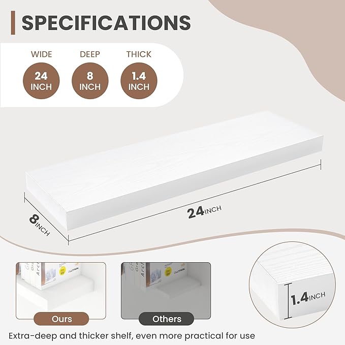 - [STABLE & SECURE INSTALLATION]: Equipped with a robust, hidden mounting bracket, these 24 inche floating shelves provide solid support for your items. Designed for easy, secure installation, they include all necessary hardware for a firm, wobble-free setup, so you can confidently display decor, photos, or functional items with style.