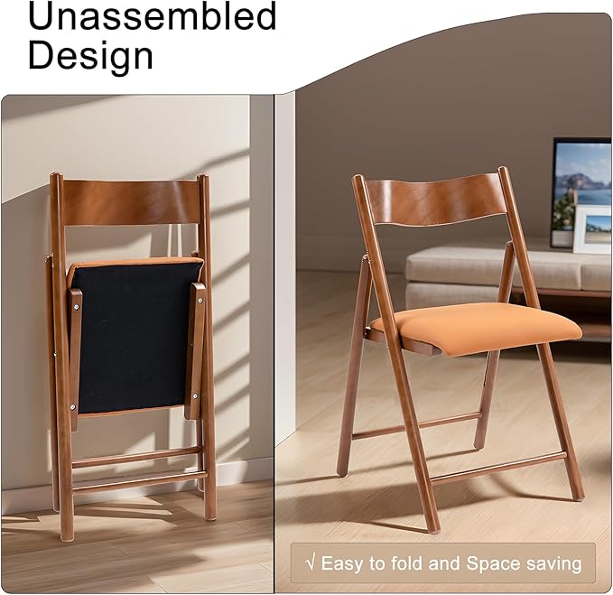 Folding Chairs Set of 2, Wooden Foldable Dining Chairs with Faux Leather Cushion 2-Pack Portable and Stackable Chairs for Dining Kitchen Office Wedding Picnic(Orange,2Pack)