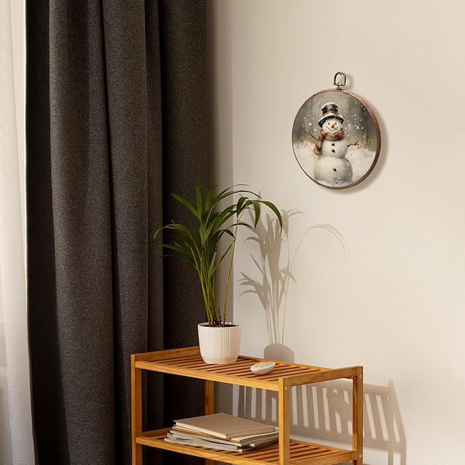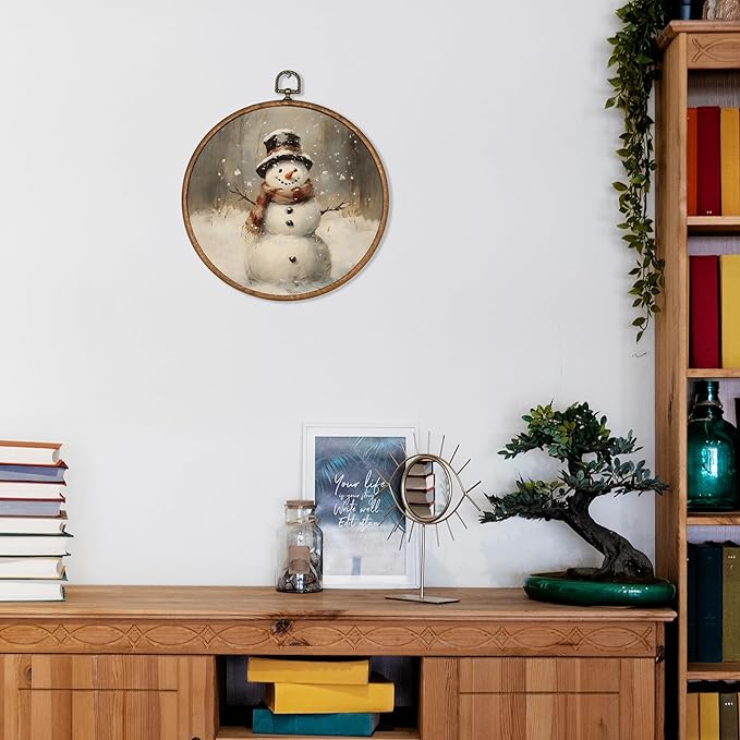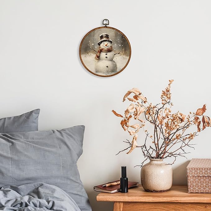 KSDUT Vintage Winter Wall Art Decor - Retro Christmas Snowy Wall Art Canvas Frame Hanging Prints, Snowman Holiday Landscape Round Wall Art Decor for Home Farmhouse Decorations 10"x10"