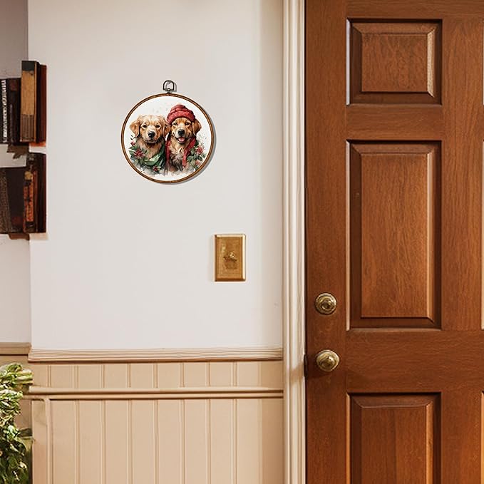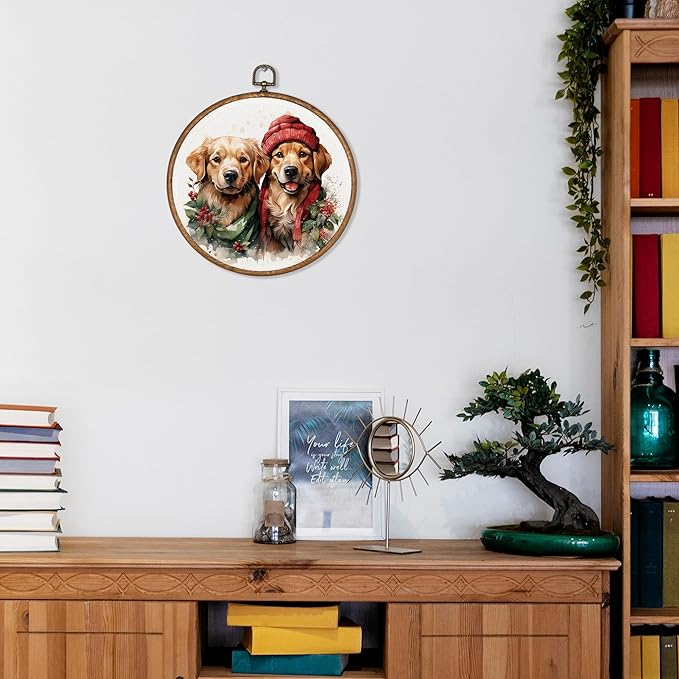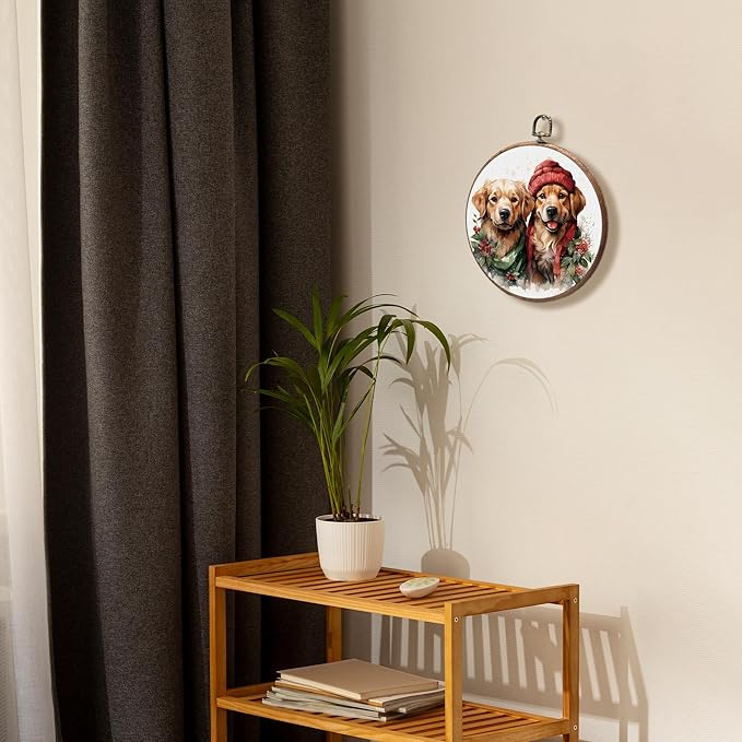 KSDUT Dog Christmas Wall Decor Art - Cute Golden Retriever Wall Art Canvas Frame Hanging Prints, Dog Puppy Xmas Holiday Round Wall Art Decor for Home Bedroom Decorations 10"x10"