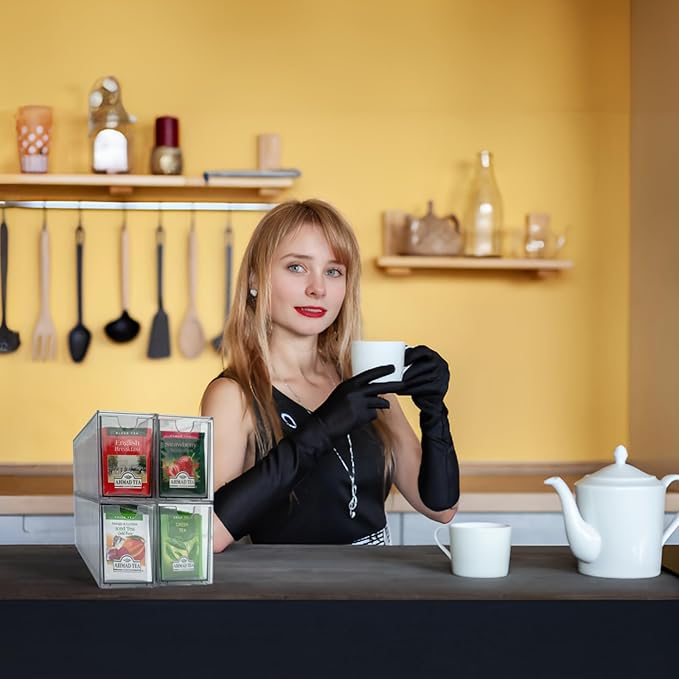 - Organize and separate your tea bags and kitchen essentials with this pack of 4 acrylic tea bag organizers. The easy pull-out drawers ensures quick access with no need to remove anything to open the lids. The no-dropping drawer design adds extra convenience