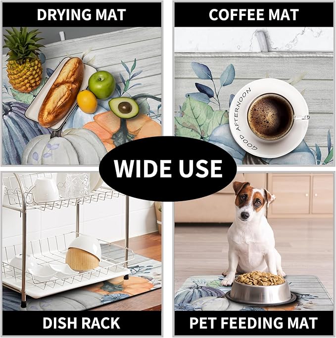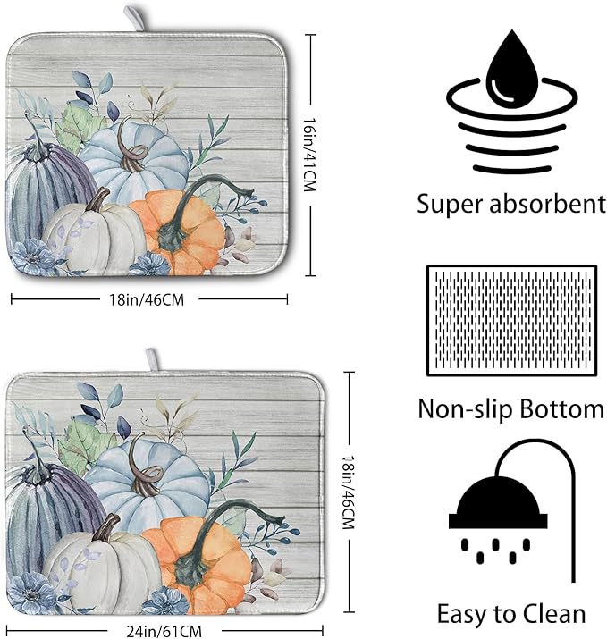 Fall Blue Orange Grey Pumpkin Kitchen Dish Drying Mat for Kitchen Counter 18x24 Inch Autumn Teal Flowers Drying Mat Thanksgiving Harvest Dish Drainer Mat Super Absorbent Dish Rack Pad for Coffee Bar