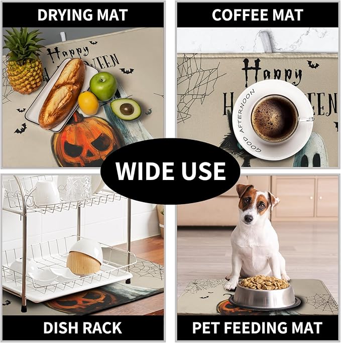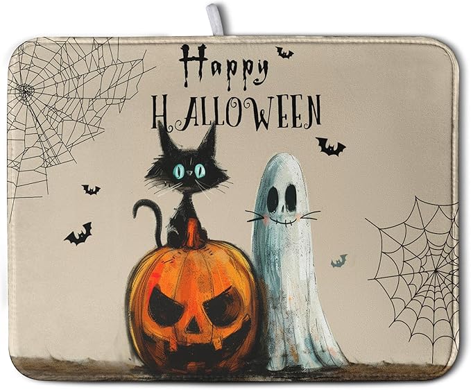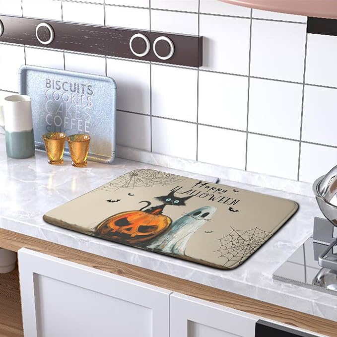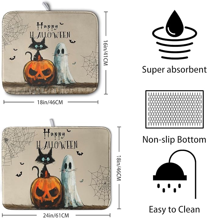 Happy Halloween Dish Drying Mat for Dishs 16x18 Inch Halloween Pumpkin Ghost Black Cat Kitchen Drying Mat Spooky Spiderweb Holiday Dish Drainer Mat Super Absorbent Dish Rack Pad for Coffee Bar Sinks