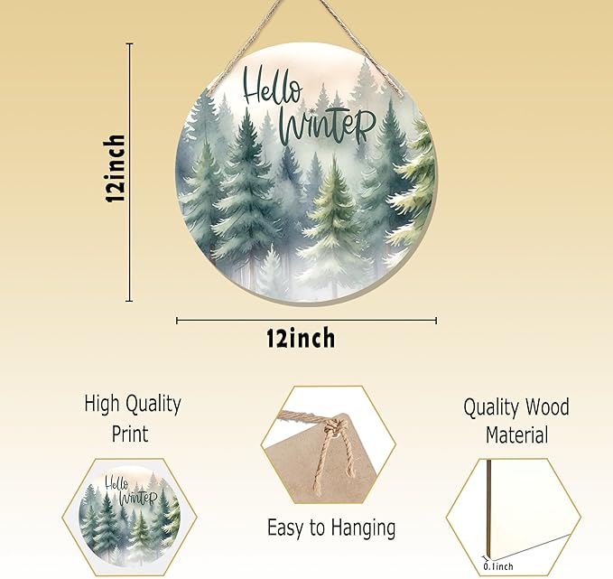 CGBHW Hello Winter Welcome Forest Wooden Sign, Winter Farmhouse Pine Trees Holiday Seasonal Decoration Hanging Sign Wall Decor, Rustic Christmas Wooden Sign for Home Office Nursery Door Decor 12 x 12 Inch