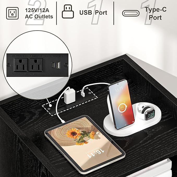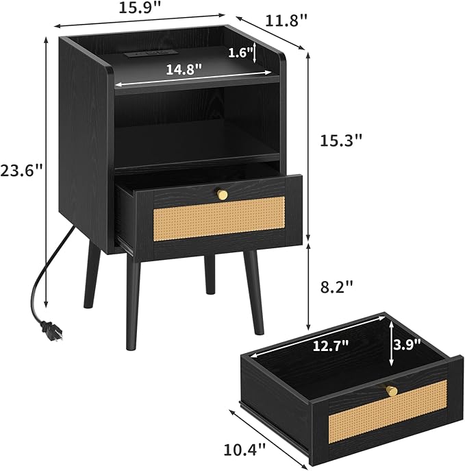 - Nightstands with Charging Station: Standing at 15.9"L x 11.8"W x 23.6"H (1 Drawers)or 15.66"D x 23.54"W x 26.61"H (3 Drawers), this rattan nightstand boasts a convenient socket with 2 outlet ,1 USB port and 1 Type-C port enabling you to charge four electronic devices simultaneously (Such as Conveniently plug in your lamps or phones). Its 4.9-foot lengths power cord offers flexibility in placement, allowing you to position the side table wherever you desire.