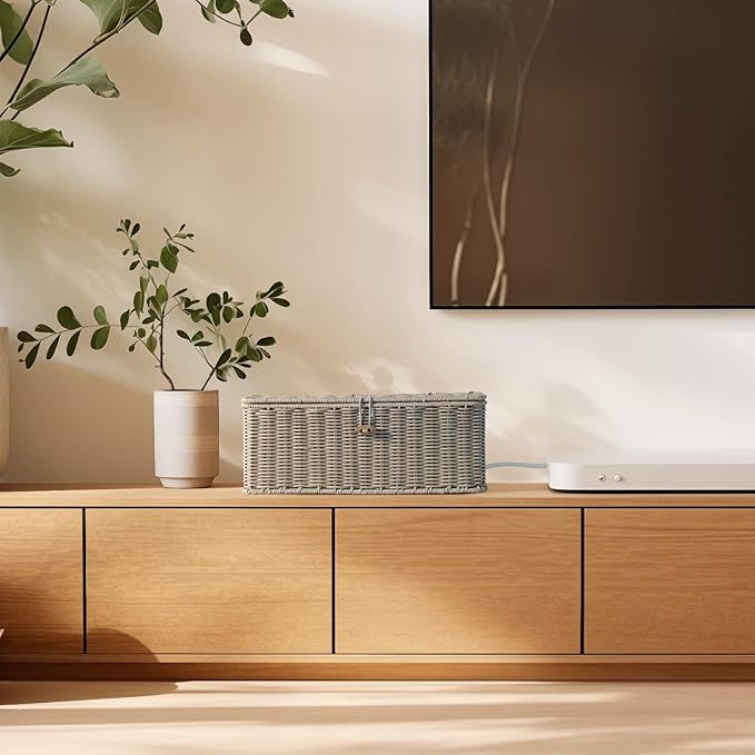 • Safe Material & Ventilation System: Brownlily cord management box ensures a sturdy thickness with safe faux rattan material. The breathable cord holder effectively prevents surge protector power strip from overheating due to its multiple air holes