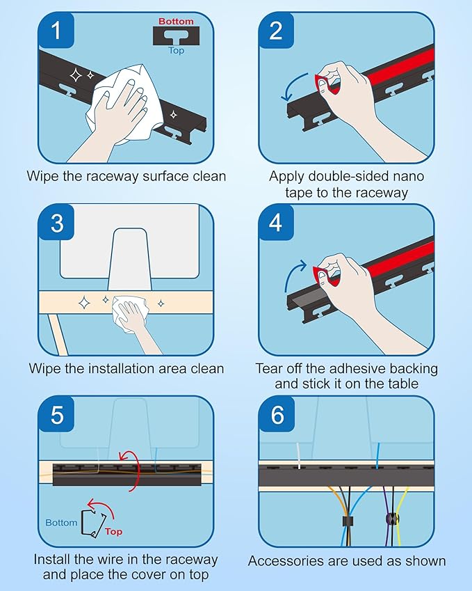 - 【Easy Installation, No Drilling Required】Our wire management for desk equipped with nano tape for hassle-free installation. Simply apply the nano tape to the bottom of the cable track, peel off the protective film, and adhere it to any smooth surface for a strong, lasting hold.