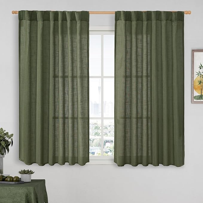 LAMIT Olive Green Light Filtering Linen Curtains 54 inches Long for Bedroom, Linen Textured Semi Sheer Back Tab and Rod Pocket Christmas Drapes for Living Room, 2 Panels, 52 x 54 Inch