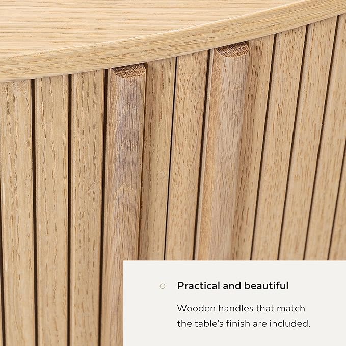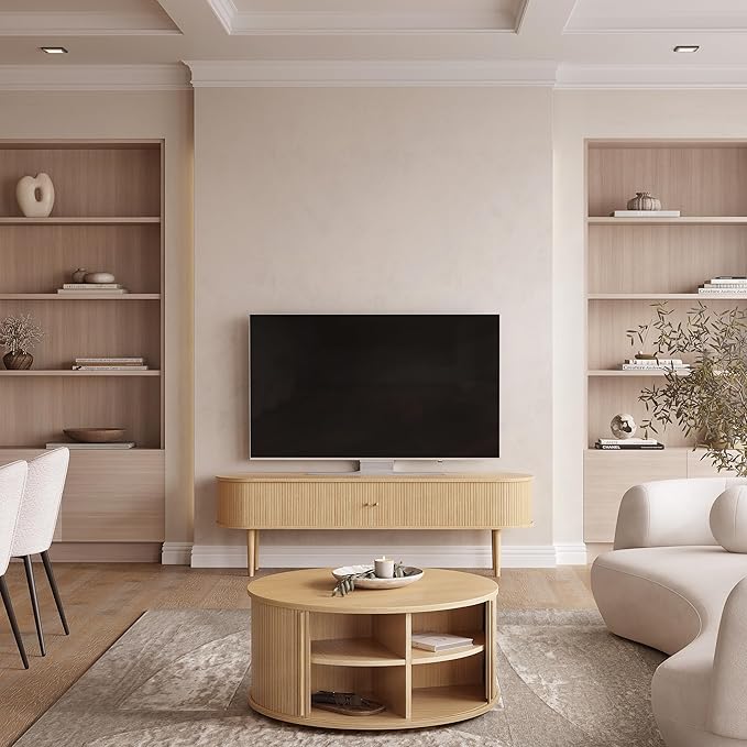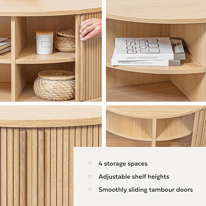 - BRING CHARACTER TO YOUR HOME with this stylish light wood coffee table, featuring curved corners and smoothly sliding tambour doors. A coffee round table is ideal for compact living rooms and offices, creating an open feel, while in larger rooms, it serves as a cozy focal point. You will receive wooden handles that match the table's finish, adding a polished touch.