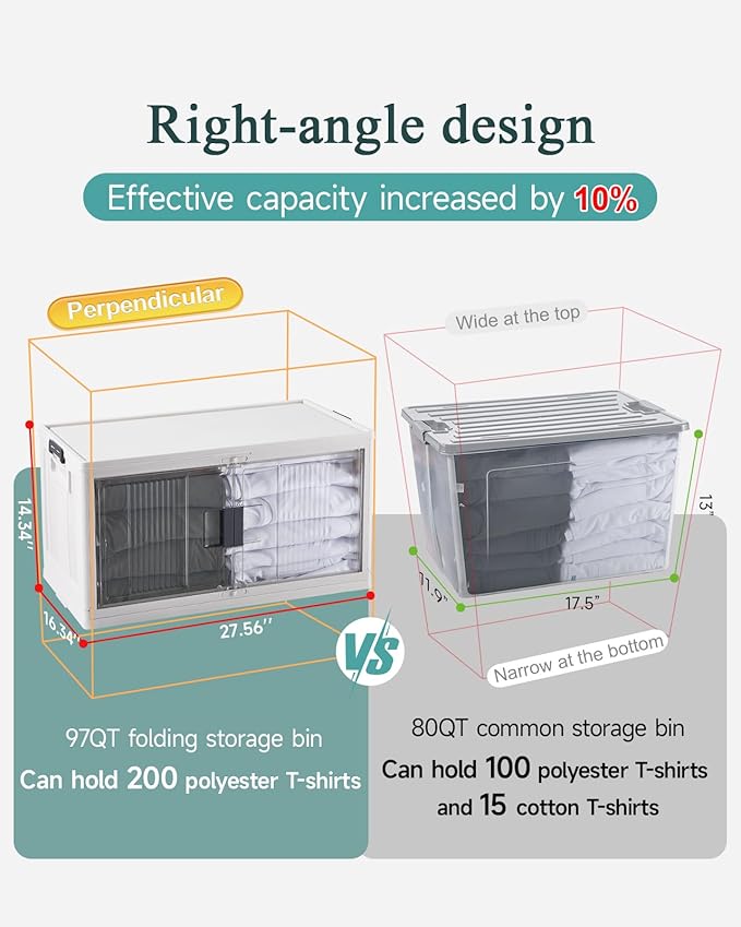 - Large Capacity: With dimensions of 23.8 inches (L) x 15.4 inches (W) x 13.3 inches (H) (2.17 inches when folded), these storage bins offer a spacious capacity of up to 97 quarts (24.25 gallons). They comfortably hold everyday items like cleaning supplies, snacks, office materials, and seasonal decorations. Their robust construction can support weights of up to 500 pounds (225KG) of weight, making them suitable for heavier items like books and tools