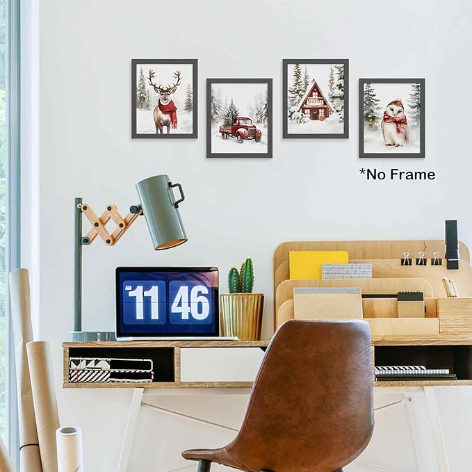 TLESKE Winter Christmas Snowy Woodland Animals Posters Prints Unframed Set of 4, Deer Reindeer Moose Owl with Red Scarf Wall Art Prints Decor for Nursery Bedroom, Christmas Pine Trees Wall Pictures, 8x10 Inches